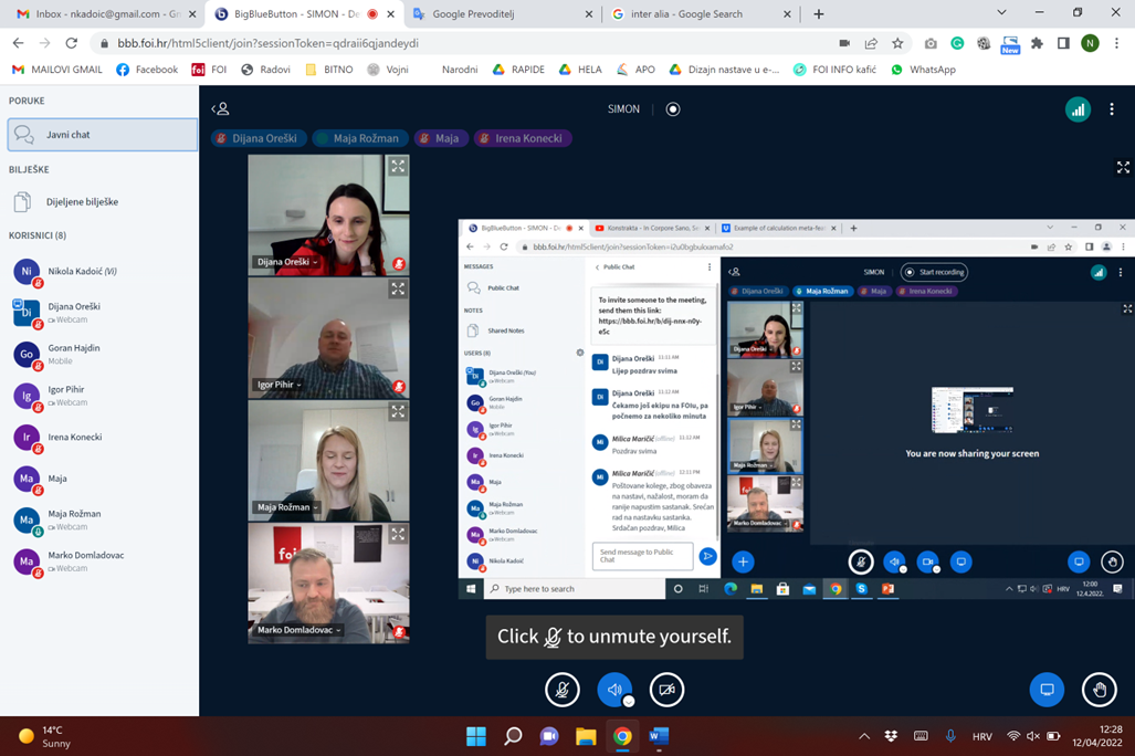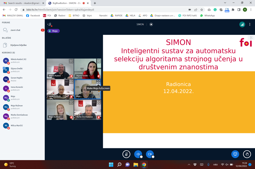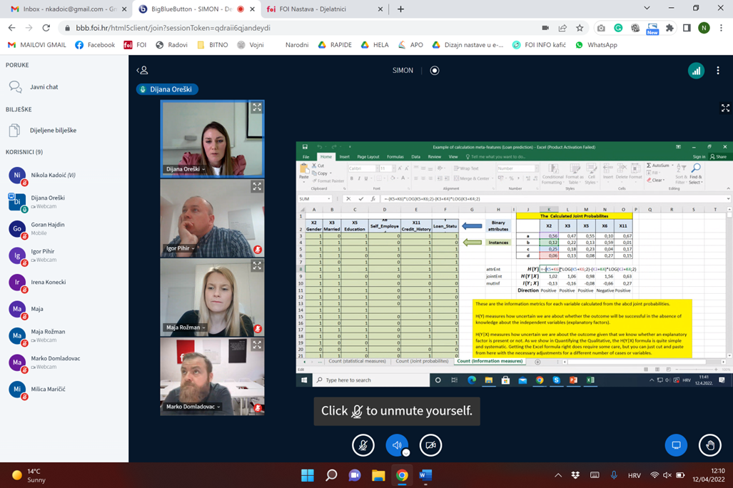 Research workshop was held at 12th April in hybrid mode: both at the Faculty of the Organization and Informatics, and online via Big Blue Button. All Project members participated. Research workshop consisted of two parts. In the first part, participants were introduced with five groups of meta-features: general meta-features, statistical-based meta-features, information-based meta-features, model-based meta-features, and landmarking meta-features. Their definitions were introduced, along with the formulas for their calculation and illustration for application in Microsoft Excel. In the second part, participants explored and interpreted meta-features of the dataset in business domain regarding loan prediction case study.